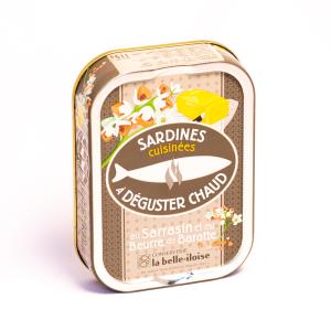 Chutný recept s nádychem extravagancie! Bohatý recept kombinujúcí sardinky s opečenou pohánkou a maslom. Ohriate pripomínajú vôňu palacniek v Bretónsku ... nechajte se tam preniesť! Najprv neotvorenú plechovku opláchnite pod tečúcou teplou vodou, obsah sa bude ľahšie vyberať. Tieto sardinky môžete ohrievať niekoľkými spôsobmi: - Na panvici: prehrievajte sardinky 3-4 minúty na veľmi miernom ohni s občasným miešaním, aby ste zachovali jemnú štruktúru rybieho mäsa. - V mikrovlnnej rúre: približne 1 minúta na 500 W. - V rúre: predhrejte na 180 °C a prehrievajte sardinky s maslom asi 7 minút v miske alebo 10 minút zabalené v papieri na pečenie. Zloženie: sardinky 69 %, maslo (mlieko) 14 %, voda, opečená pohánka 4,9 %, morské riasy, jablčný ocot, slnečnicový olej, byliny, zemiakový škrob, citrónová šťava, olej z údených hroznových jadier, soľ