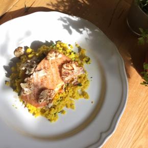 1 Morského ostriežika osolíme a okoreníme, kožu filety zľahka zaprášime múkou. 300 g morského ostriežika (filet s kožou) hladká múka soľ a korenie