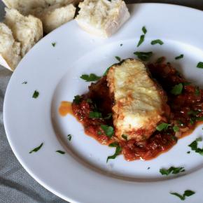 Makrelu zľahka potretú olivovým olejom, osolenú a okorenenú vložíme do zapekacej misy, ktorú sme tiež vytreli olivovým olejom. Ryby v mise pokvapkáme asi dvoma lyžicami červeného vínneho octu a zalejeme troškou suchého bieleho vína. Pečieme v rúre na 180°C asi 20 minút (podľa veľkosti ryby). Hneď, ako je ryba hotová, pomocou polievkovej lyžice rybu od chrbta vykostíme a filety položíme na rozohriaty tanier. Vypečenú šťavu, pokiaľ je veľmi riedka zredukujeme v malom hrnci na správnu hustotu. Omáčkou prelejeme filety z ryby a podávame napríklad s opečenými zemiakmi a cibuľkou.