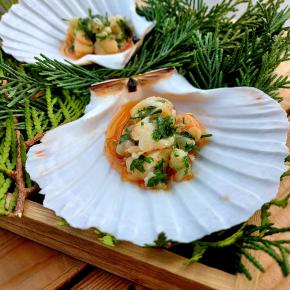 | Langustinové ragouté s medvedím cesnakom a yuzu  Špagety so slávkami a janovským pestom  Pstruh lososovitý, hrozienka, píniové oriešky, smotana