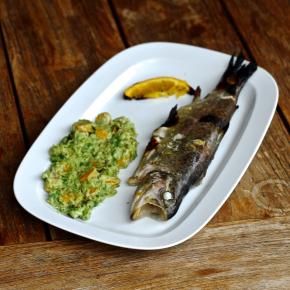 | Losos na ázijský spôsob s pak choi  Grilovaný pstruh na fenikli a pomarančoch  Vojnové kura s krevetami
