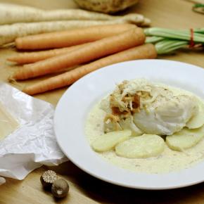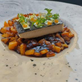 | Grilovaný morský vlk s tekvicovým ragout  Treska Skrei s fermentovaným zelerom  Treska, koreňová zelenina, smotana, muškátový orech