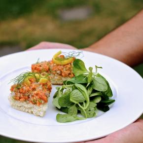 | Tatarák z divého lososa  Pražma so smotanovo šalviovou omáčkou  Tatarák z lososa s pistáciami a horčičným dressingom