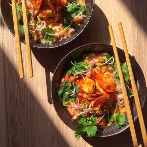 | Thajská krevetová polievka  Grilovaná makrela so šalátom z červenej repy  Špagety so slávkami a janovským pestom