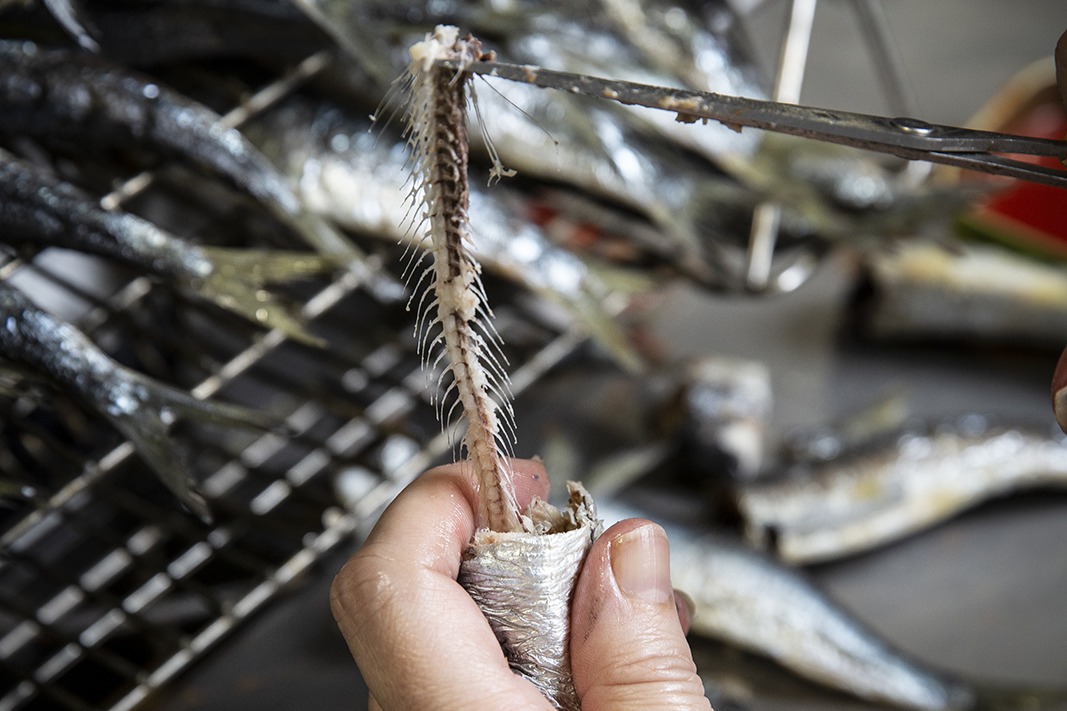 Potom pracovníci vyberajú sardinky jednu po druhej zo stojanov, odstrihávajú z nich tzv. goliere (zvyšky kože po odstránení hláv) a chvostové plutvy a ukladajú ich do plechoviek. Najskúsenejši technici výroby odstraňujú chrbtice pre produkty z rady vykostených sardiniek.