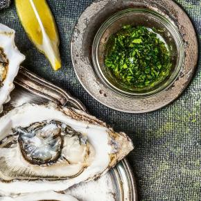 | Fish and chips  Koriandrovo-cesnaková omáčka na ustrice  Omáčka Mignonette na ustrice