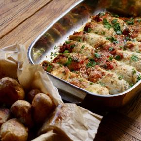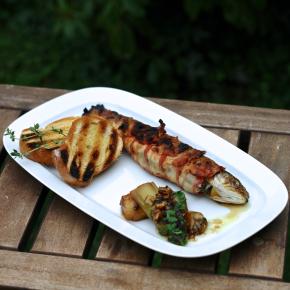 | Plnené závitky z mečiara  Grilovaný sivoň v pancette s pórom na víne  Pražma, cibuľa, mäsový vývar, bylinky