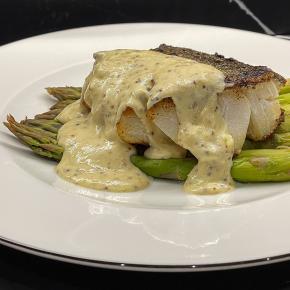 | Burger s vyprážanou treskou a kôprovým dresingom  Treska SKREI s horčicovou omáčkou  Kambala pečená so zemiakmi a rozmarínom